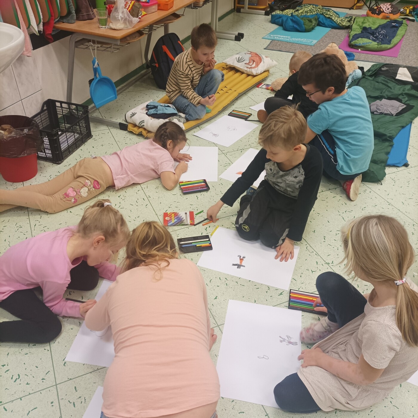 V jednom večeru se naši prvňáčci stihli proměnit ve čtenáře, posluchače, luštitele, loutkoherce, knihy i malíře a prožili tak kouzelnou atmosféru noci strávenou povídáním, čtením, hraním a nakonec i spaním ve školní třídě.