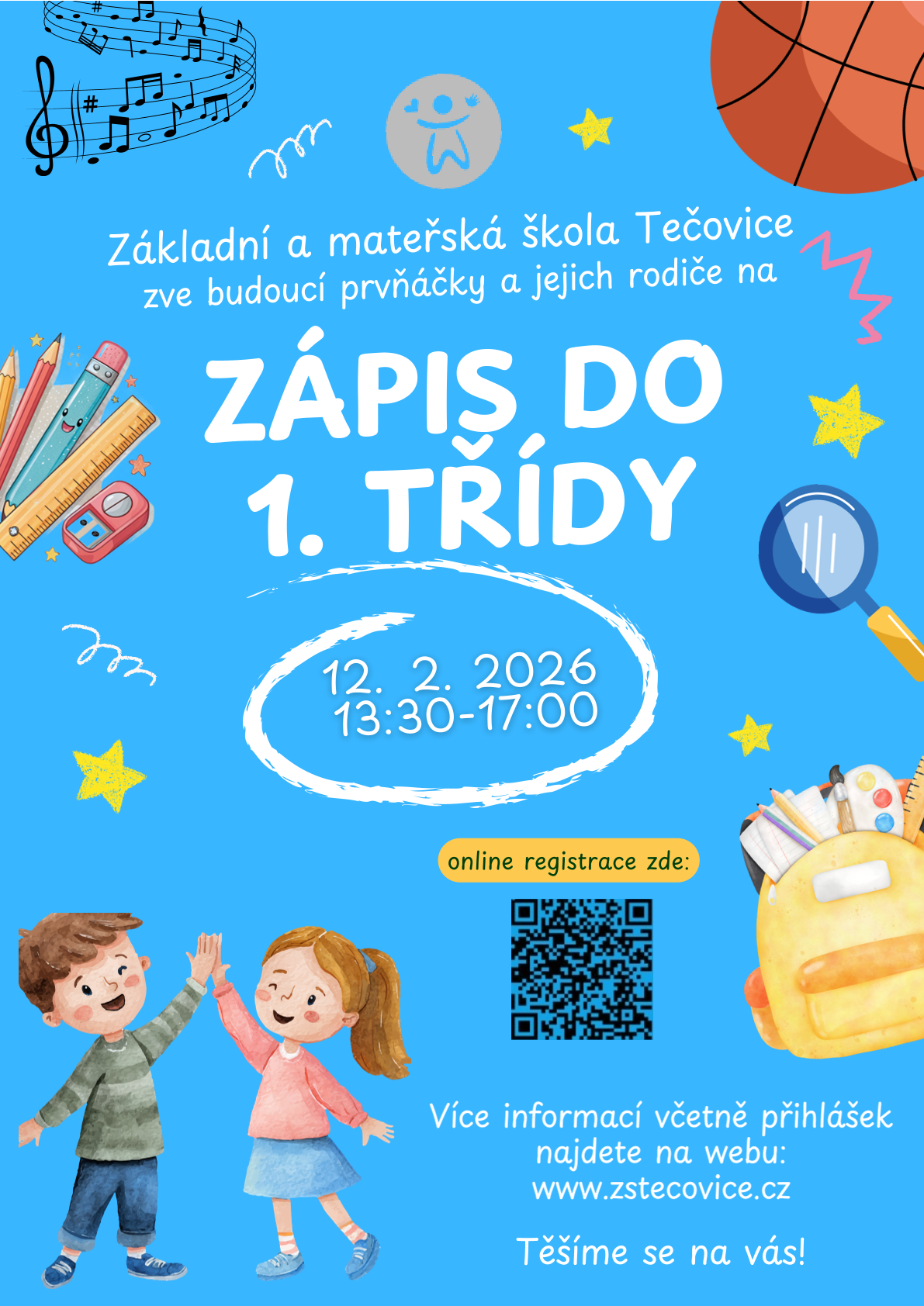 Kdo se dostaví: K zápisu se dostaví zákonní zástupci s dětmi, které do 31. 8. 2026 dovrší 6. rok věku (narozené od 1. 9. 2019 do 31. 8. 2020).