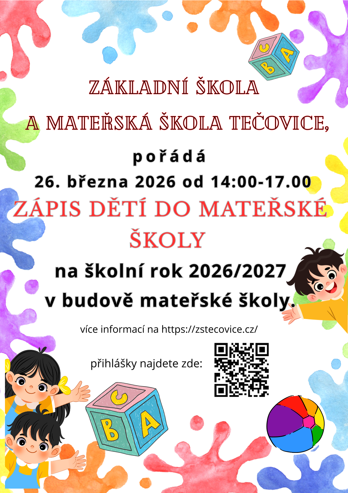 ředitelství Základní školy a Mateřské školy Tečovice oznamuje, že zápis dětí k předškolnímu vzdělávání pro školní rok 2026/2027 proběhne dne 26. března 2026 v době od 14:00 do 17:00 hodin v budově naší mateřské školy.